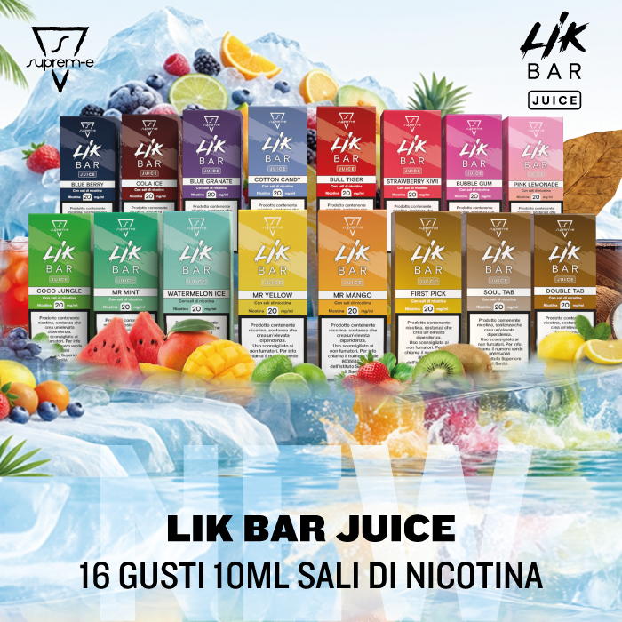 Creazione del Brand LIK BAR dedicato alla produzione di Sigarette Elettroniche e Sistemi Pod, siano essi Ricaricabili o Precaricati. LIK BAR oltre alla Linea STILL e FLY POD, propone anche una Linea di Liquidi per Sigaretta Elettronica e la linea di Sacchetti di Nicotina LIK BAR Nicotine Pouches.